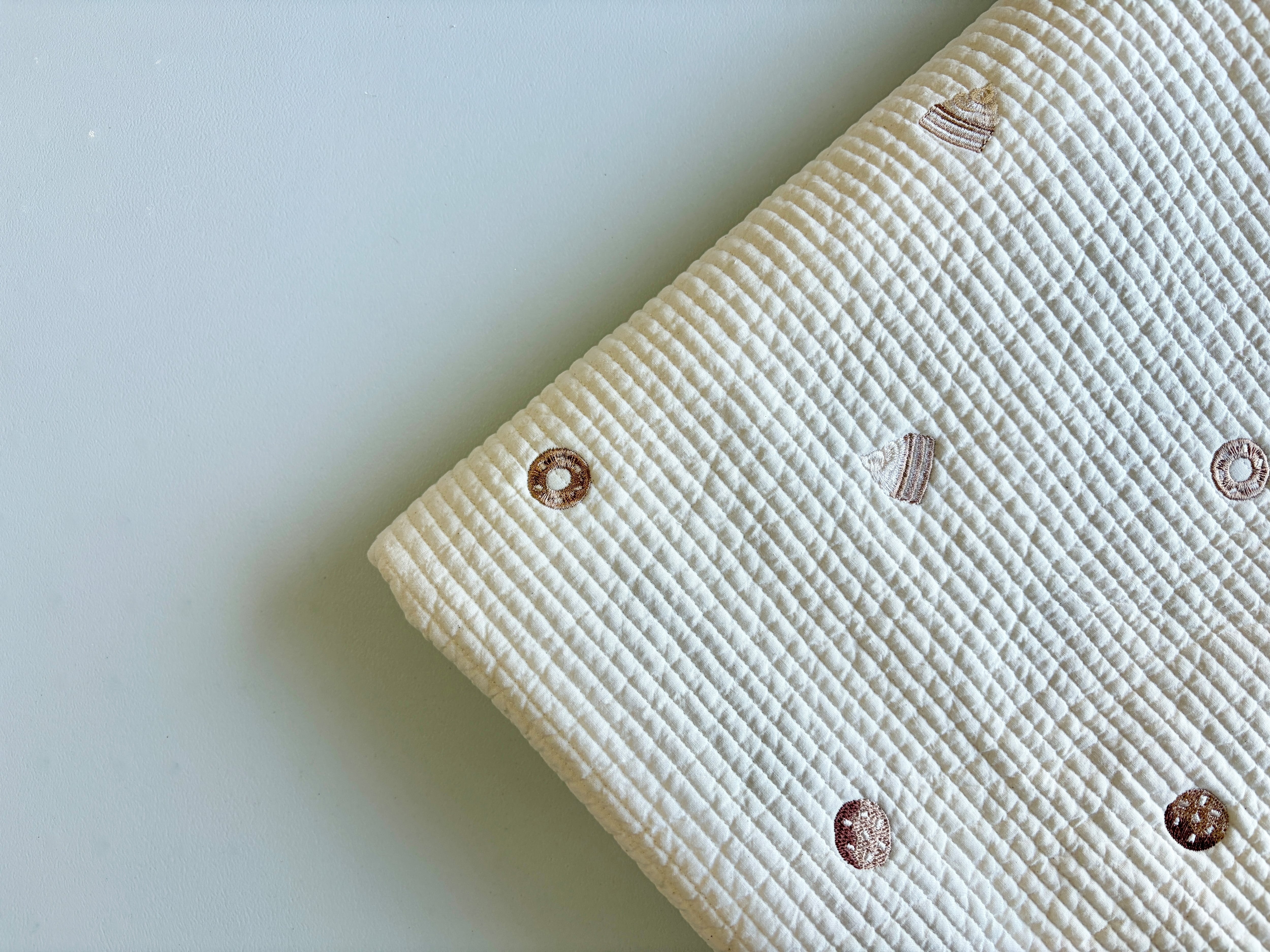 やさしいベージュカラーのイブル生地に、ドーナツやケーキの刺繍を散りばめた刺繍イブルです。