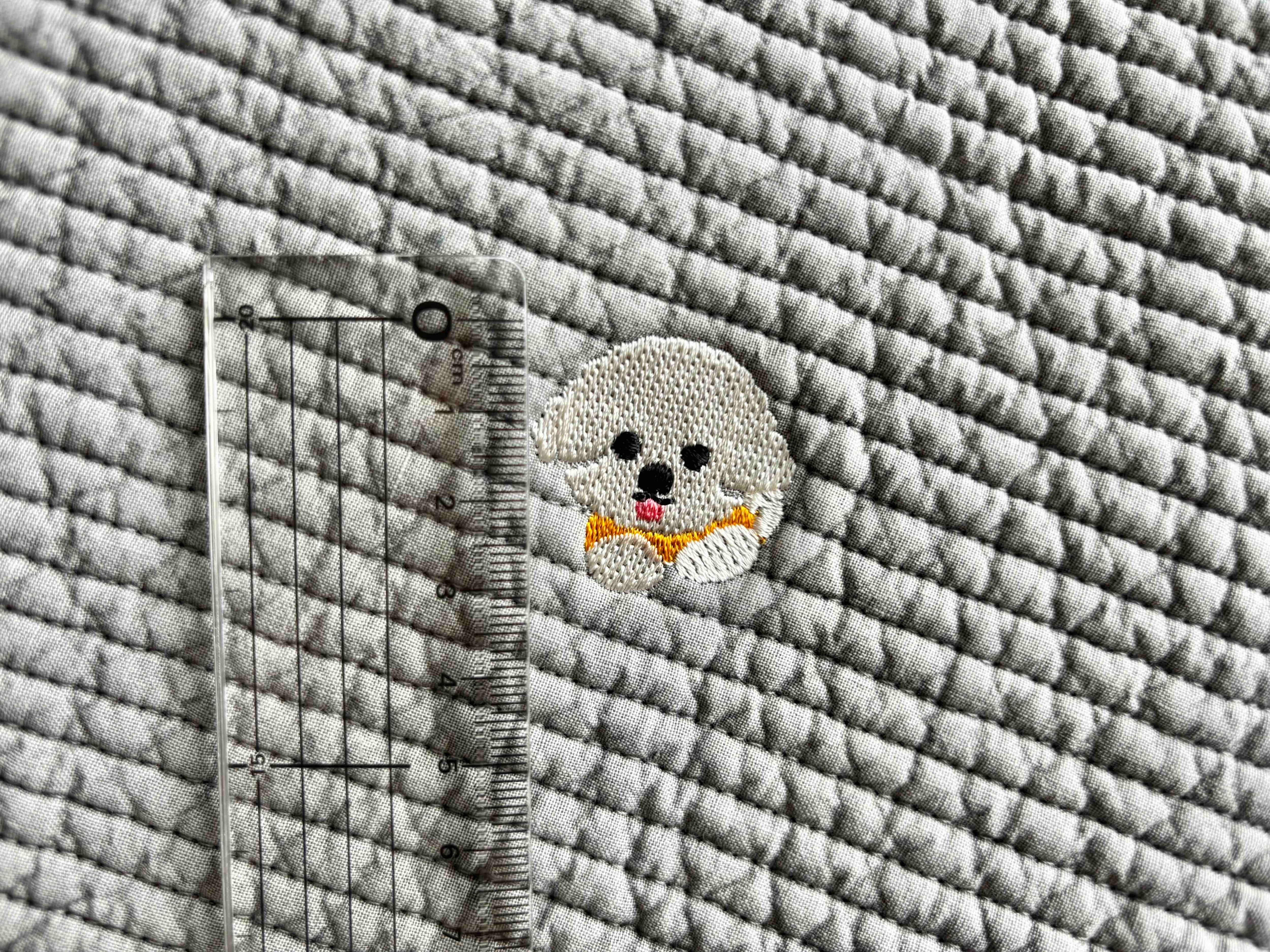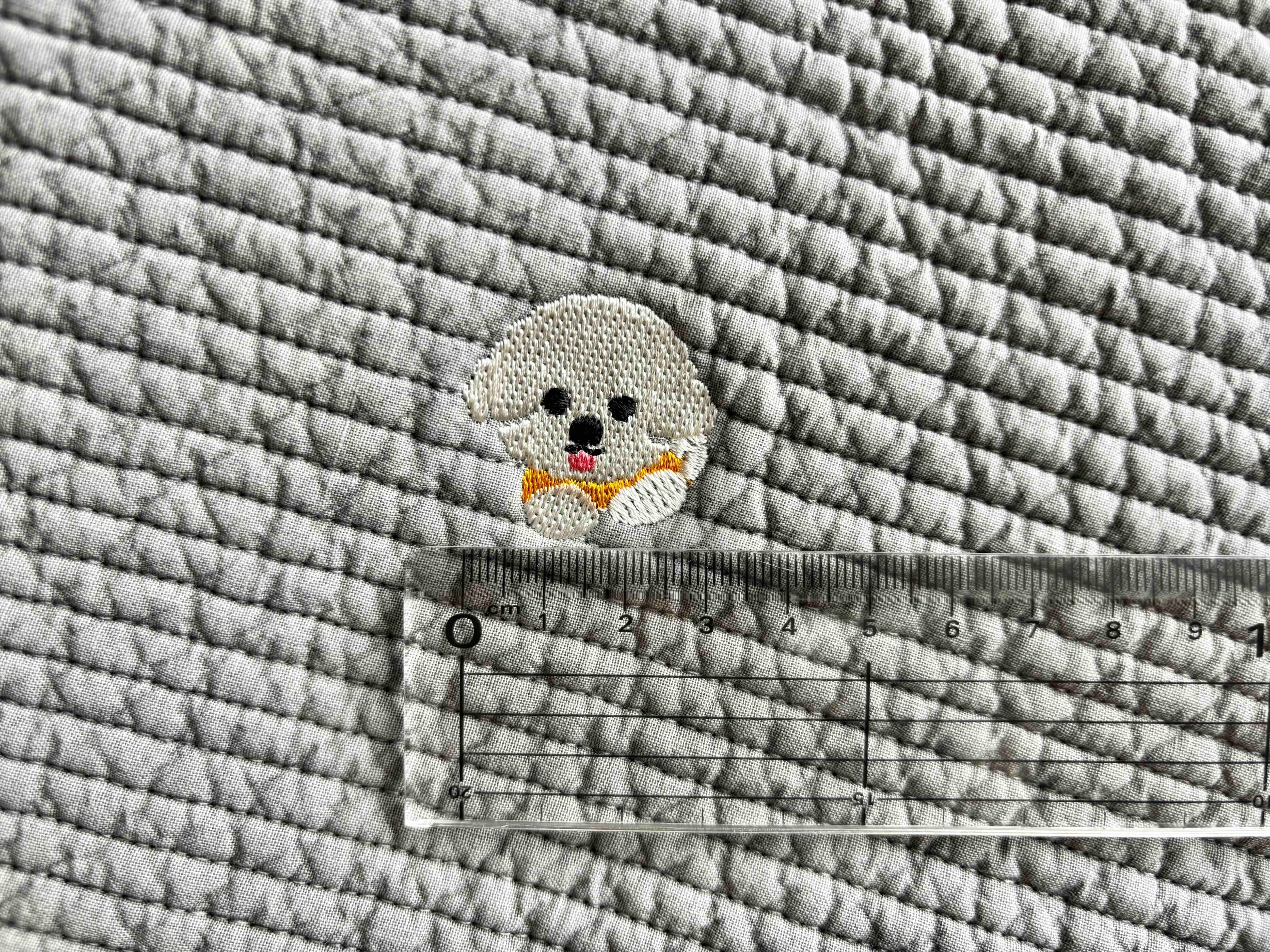 ∞サイズ:刺繍サイズ、おおよそハートが縦横10mm、犬が縦30mm横32mm
